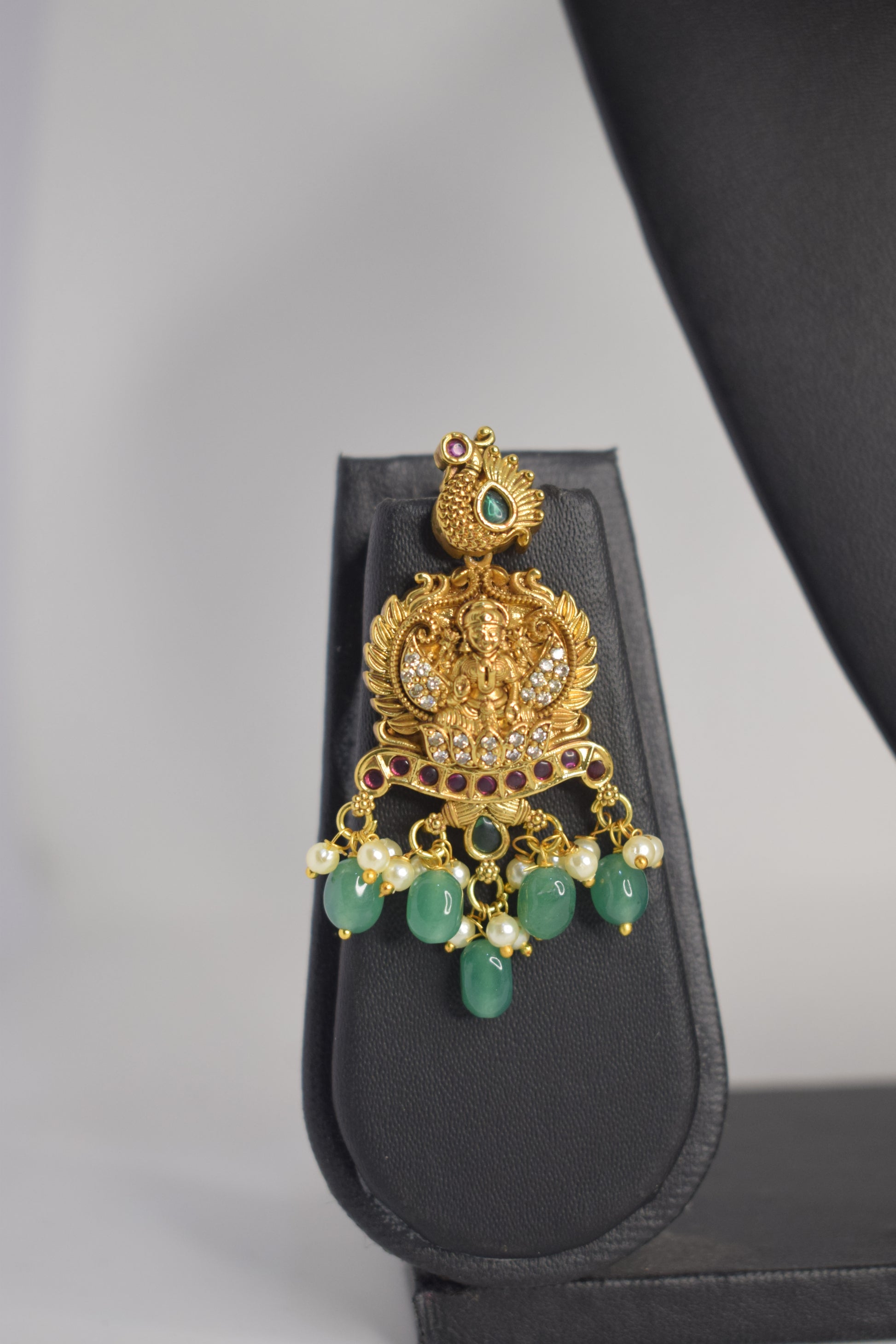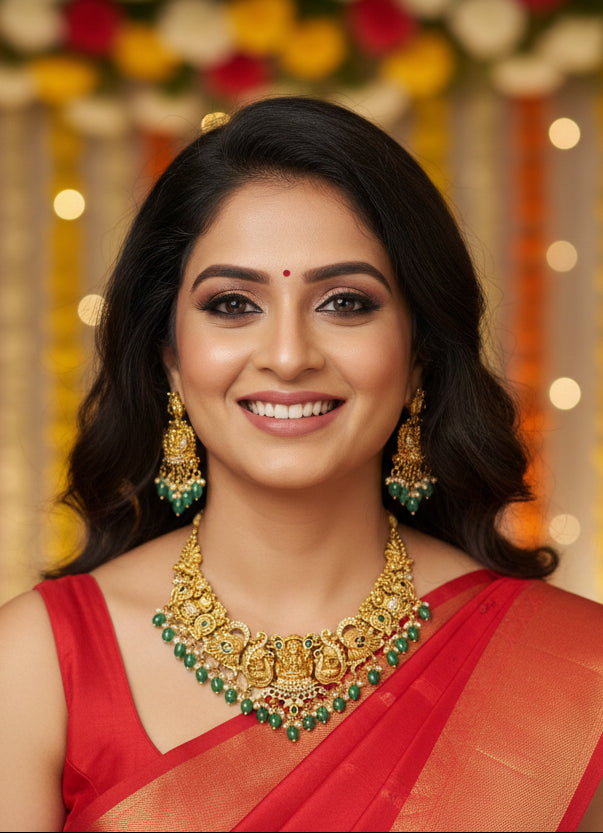 This exquisite matt finish temple necklace set features a divine Lakshmi motif with intricate detailing and elegant green bead drops, paired with matching earrings. Perfect for weddings and festive occasions, it delivers a rich, royal look with timeless traditional charm.