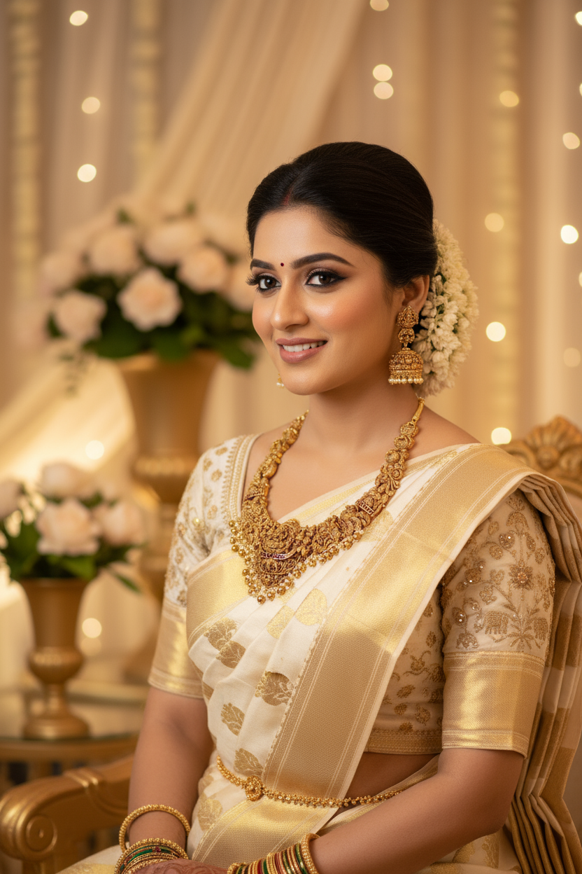 This exquisite 3D temple necklace, paired with grand jhumkas, features intricate Lakshmi carvings accented by delicate pearl drops. Designed to complement bridal attire and ceremonial occasions, it beautifully enhances the elegance of Kanchivaram and Banarasi sarees. A refined choice that adds a distinguished and traditional touch to your ensemble.
