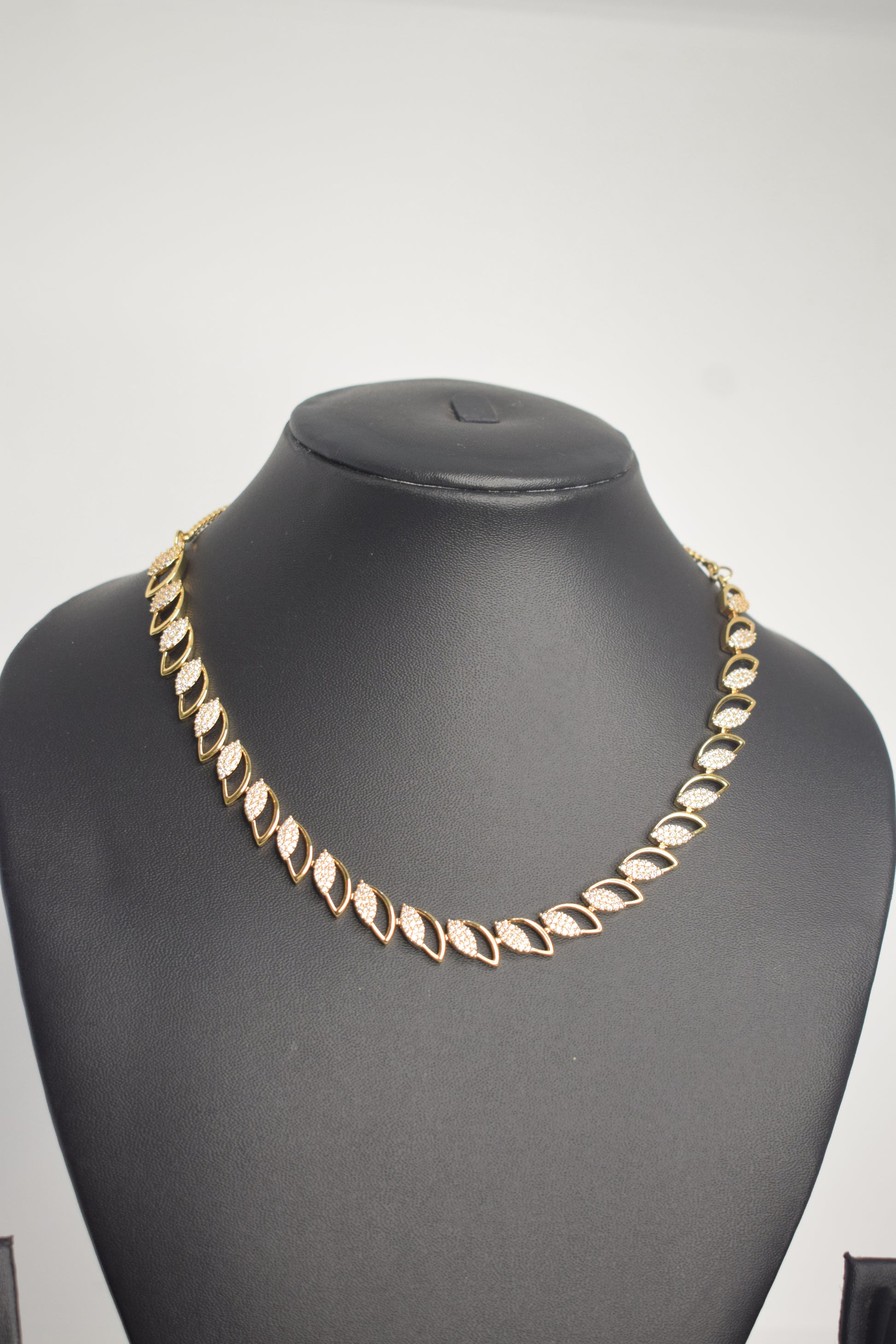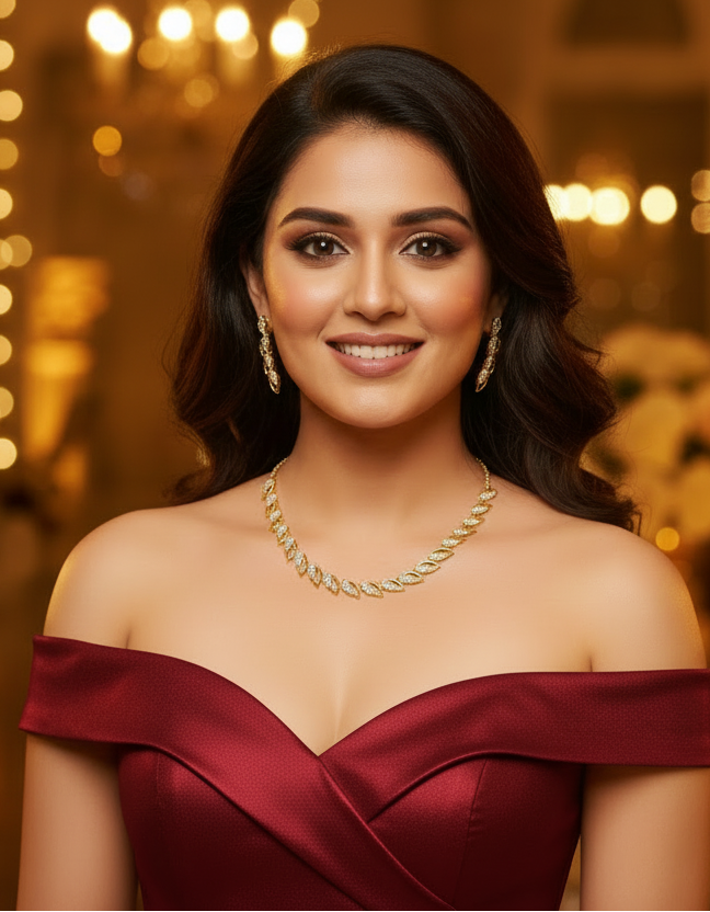 This elegant diamond-replica necklace features a sleek leaf-motif design with lasting shine, paired with cute and trendy matching earrings for a refined party look. Perfectly versatile, it complements western outfits, cocktail sarees, and blazers, making it an effortless choice for modern celebrations.