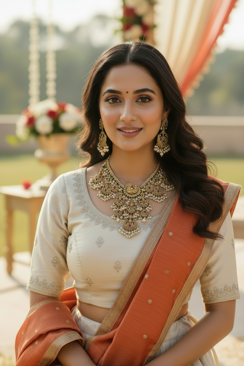 The Grand Dasavataram Gutta Poosalu necklace paired with matching earrings features two meticulously crafted strands, ideal for weddings and special occasions. This exquisite set showcases traditional design elements that enhance your ensemble with elegance and cultural significance, making it a perfect choice for memorable celebrations.