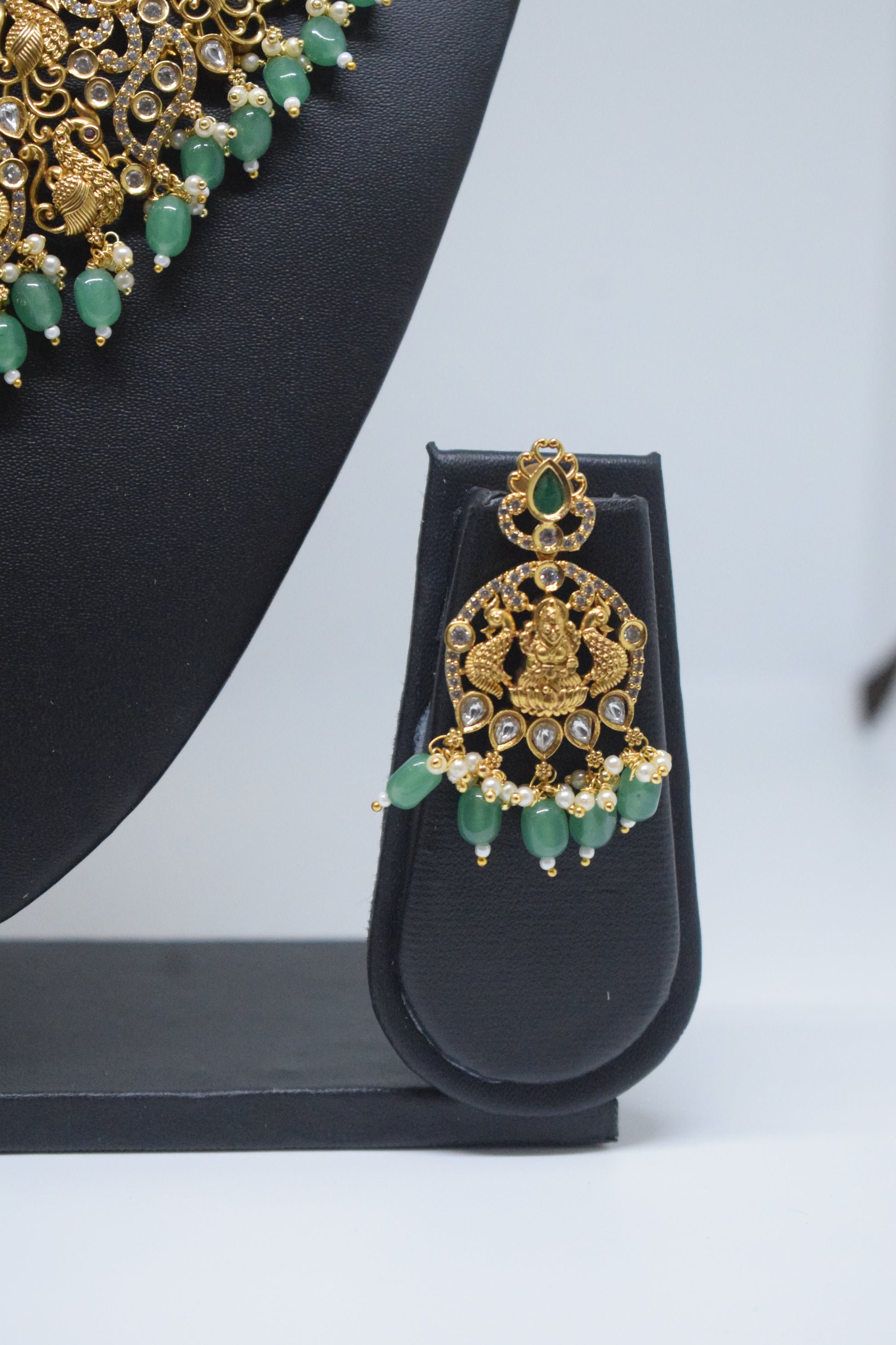 This heavy choker set features intricate 3D detailing with a central Lakshmi motif, complemented by lustrous pearls, sparkling stones, and vibrant green beads. Designed for weddings and special occasions, it combines traditional craftsmanship with a bold aesthetic to enhance your festive attire. The matching earrings complete the set, providing a cohesive and elegant look that highlights your cultural heritage with sophistication.
