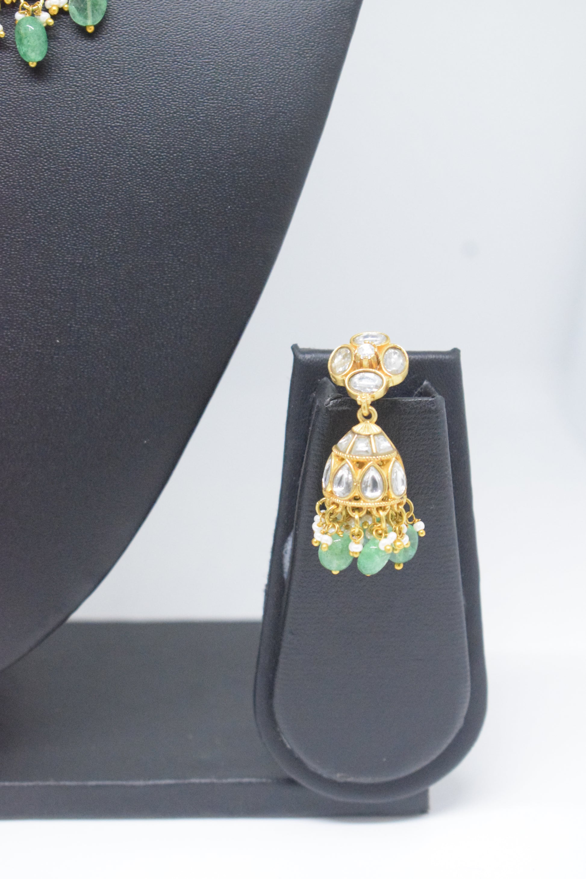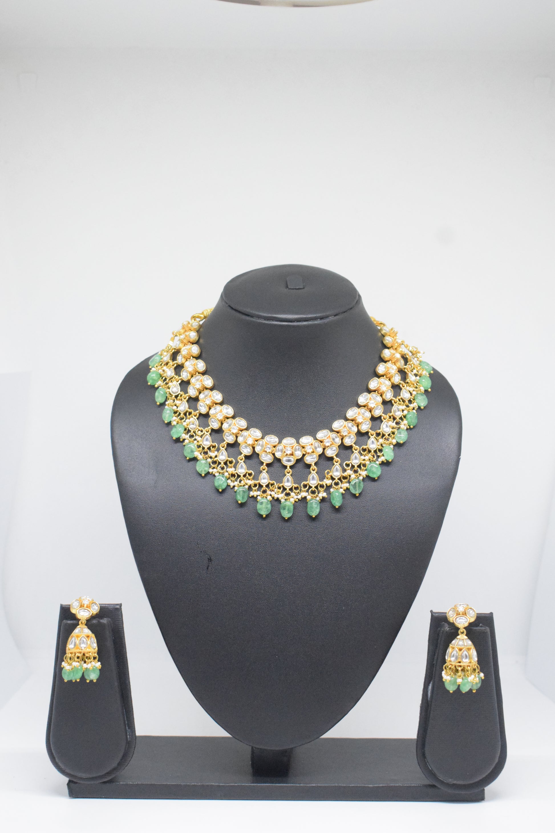 This Jadau Kunan flexible choker, embellished with white kundans and green beads, is an elegant accessory designed for parties and weddings. Its flexible design ensures comfortable wear, perfectly complementing traditional lehengas and sarees. Paired with matching jhumkas, this set enhances your festive look with its timeless craftsmanship and vibrant detailing.