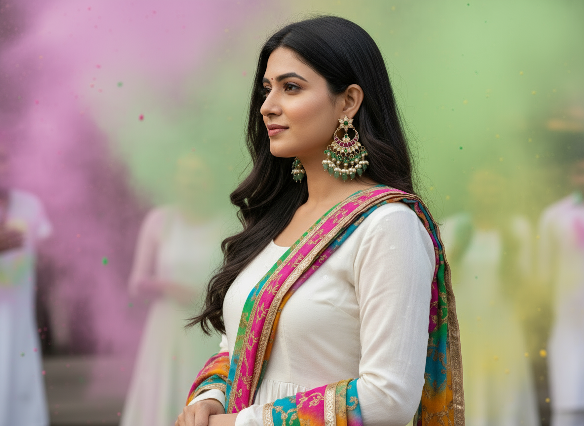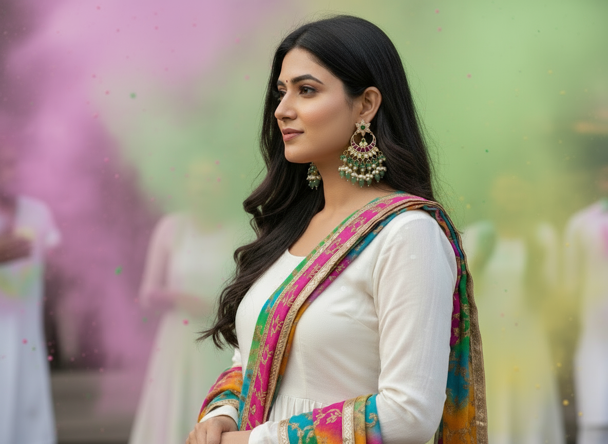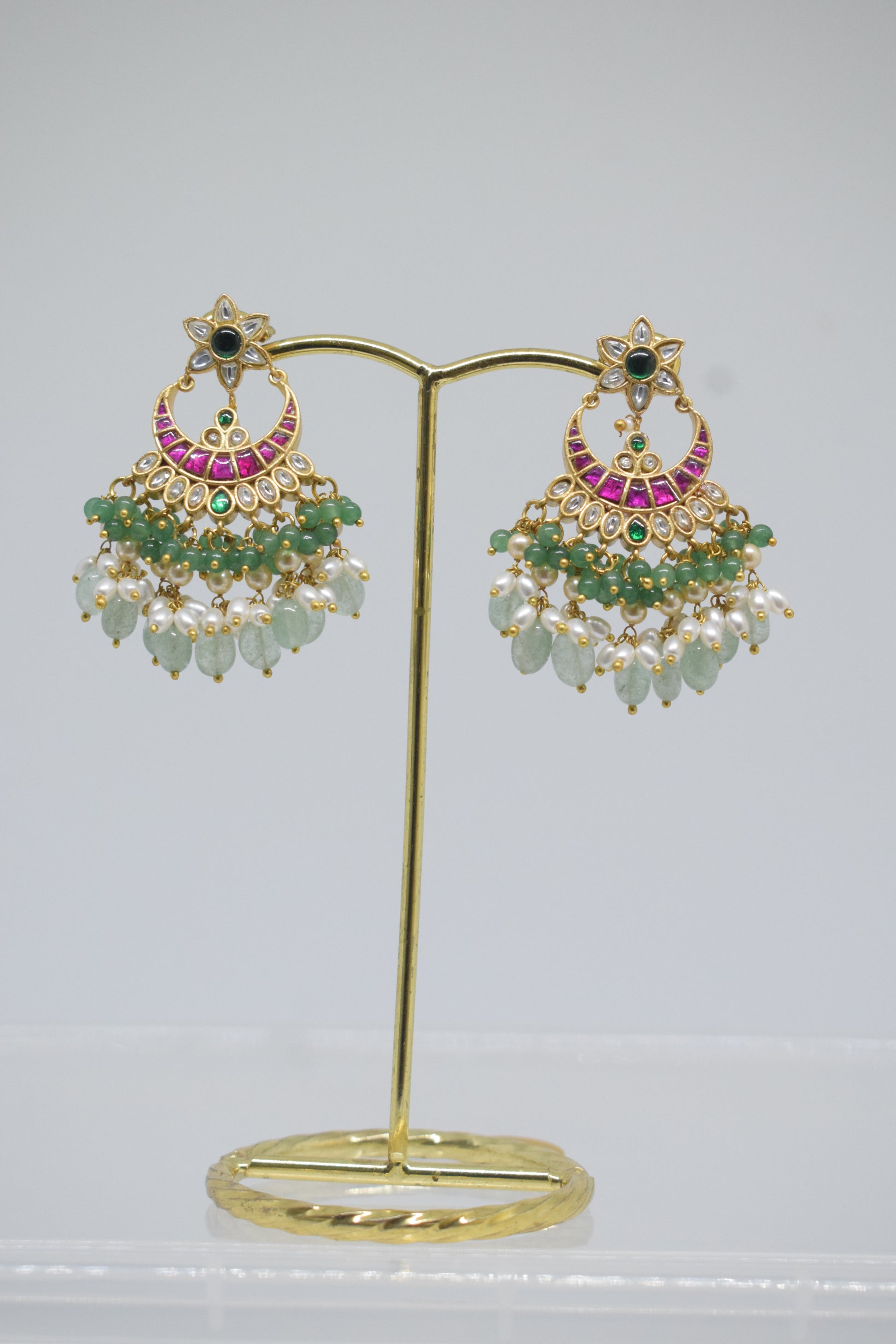 Elevate your festive look with these Jadau Kundan Chandbalis, featuring exquisite green beads that reflect premium craftsmanship. Perfect for parties, marriages, and special events, their elegant design enhances any traditional attire with sophistication.