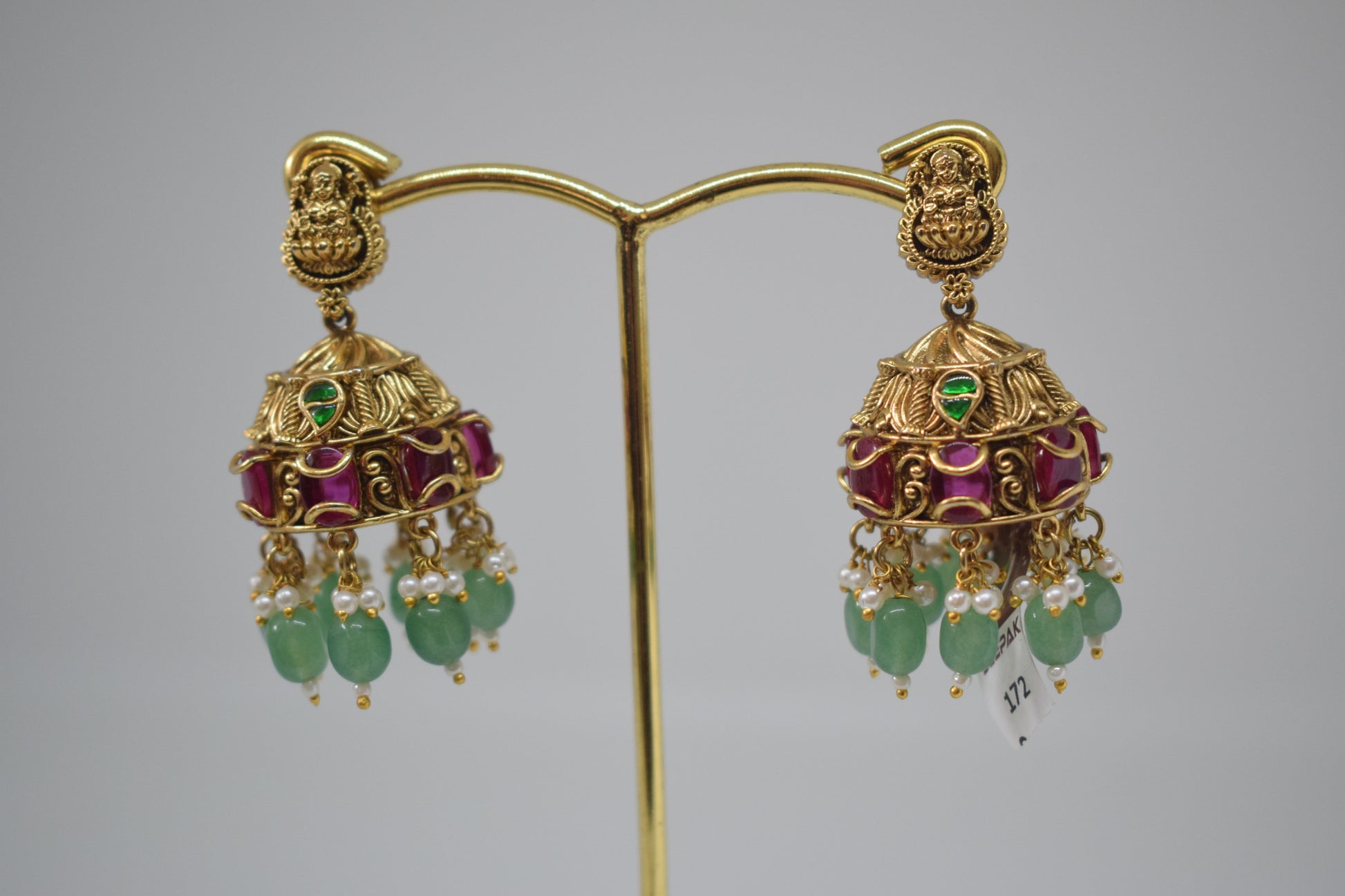 These Jadau Kundan Jhumkas feature intricate craftsmanship with green bead and pearl drops, adding elegance to your festival attire. Their traditional design ensures a timeless appeal, perfect for enhancing festive celebrations.