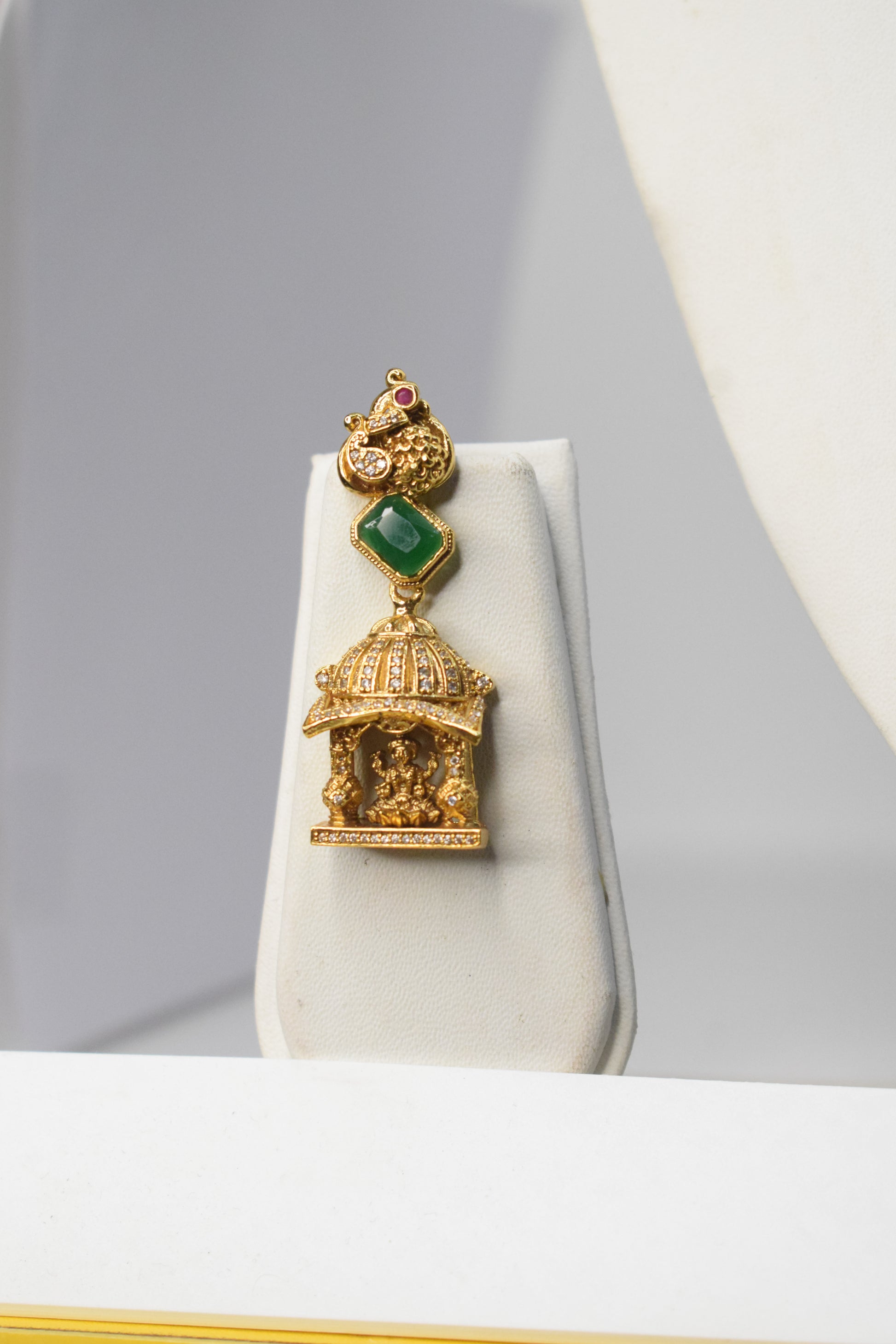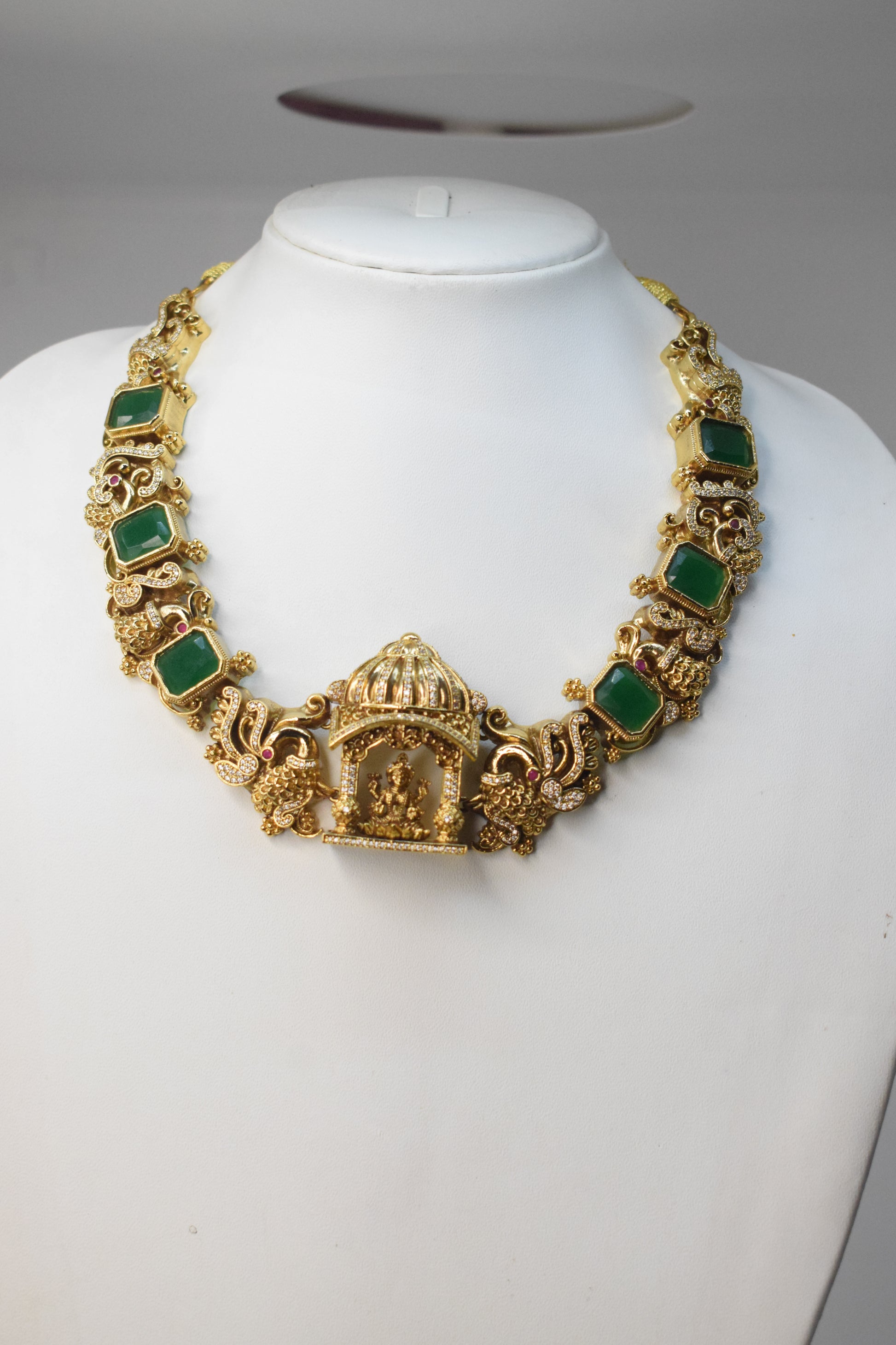 A royal short-length statement necklace crafted with 3D temple design, uncut stones and emerald accents—giving a rich, queen-like grand look. A true masterpiece for festive and bridal elegance.