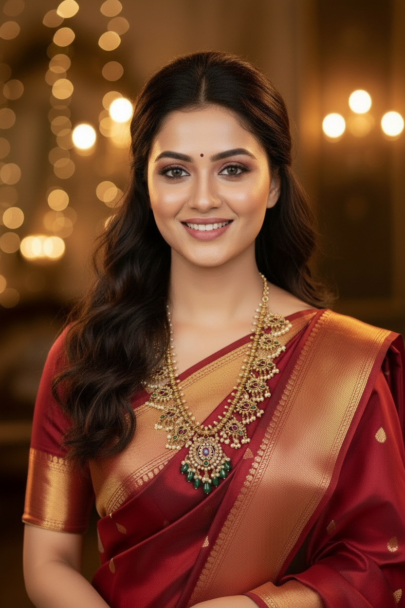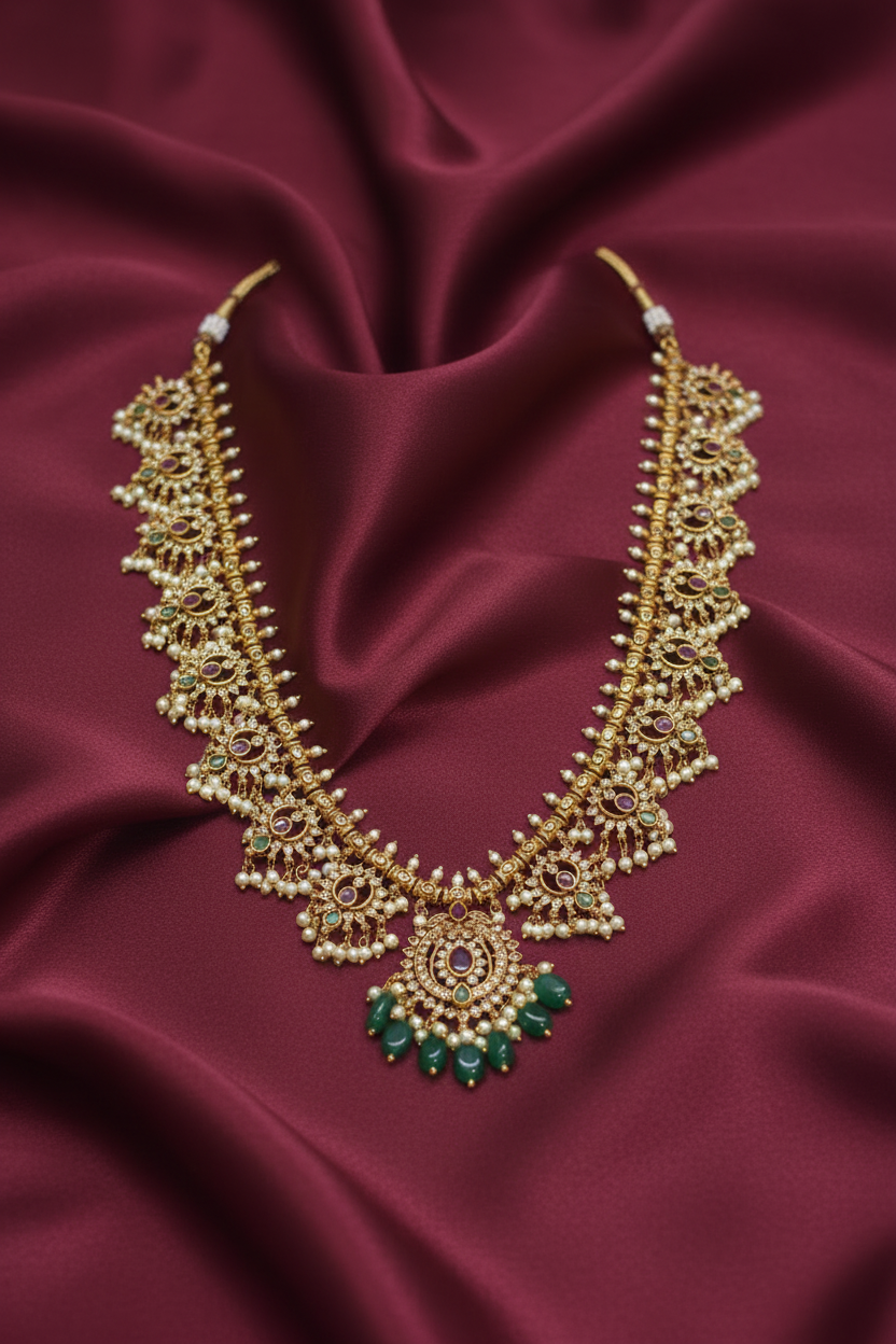 Elevate your festive ensemble with this exquisite short necklace, masterfully crafted with lustrous pearls and vibrant ruby accents. Designed to complement traditional silhouettes, it pairs beautifully with sarees and ethnic kurtas, adding refined elegance to your celebration look. The balanced proportions make it an ideal choice for weddings, festivals, and special occasions where timeless sophistication matters.