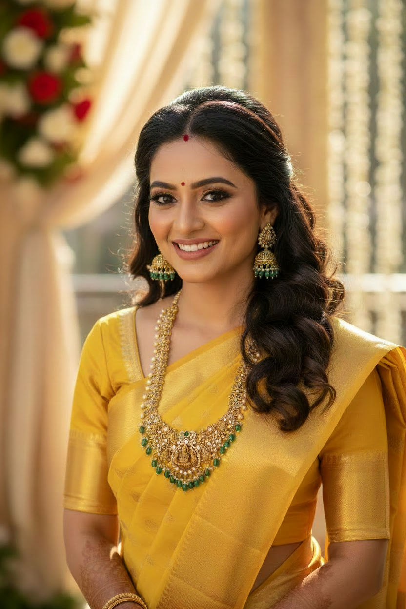 Style this set with ethnic kurtas, anarkali sets, silk sarees, bridal lehengas, or festive Kanchipuram drapes; keep makeup minimal and hair in a bun or braid to let the jewellery shine.
