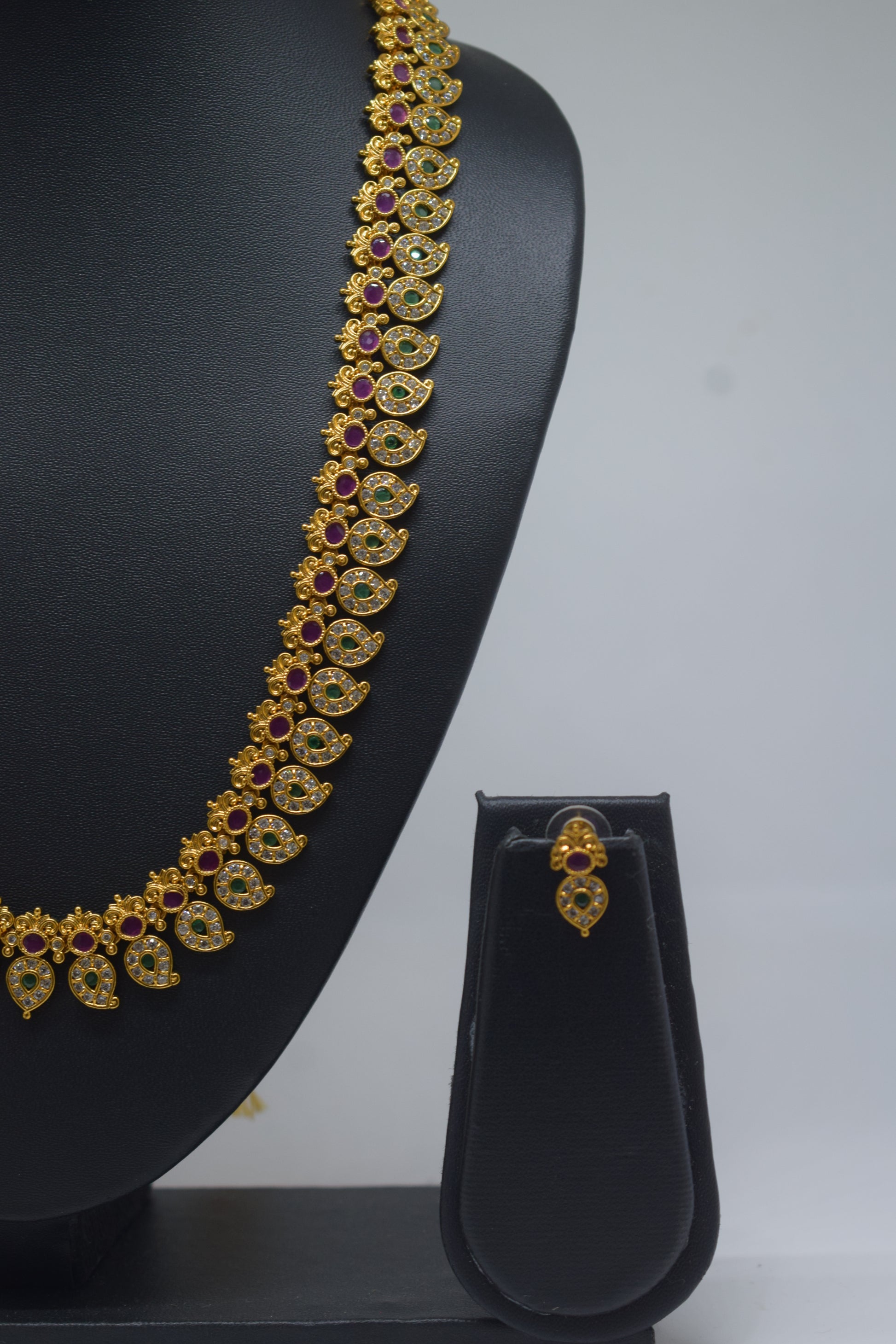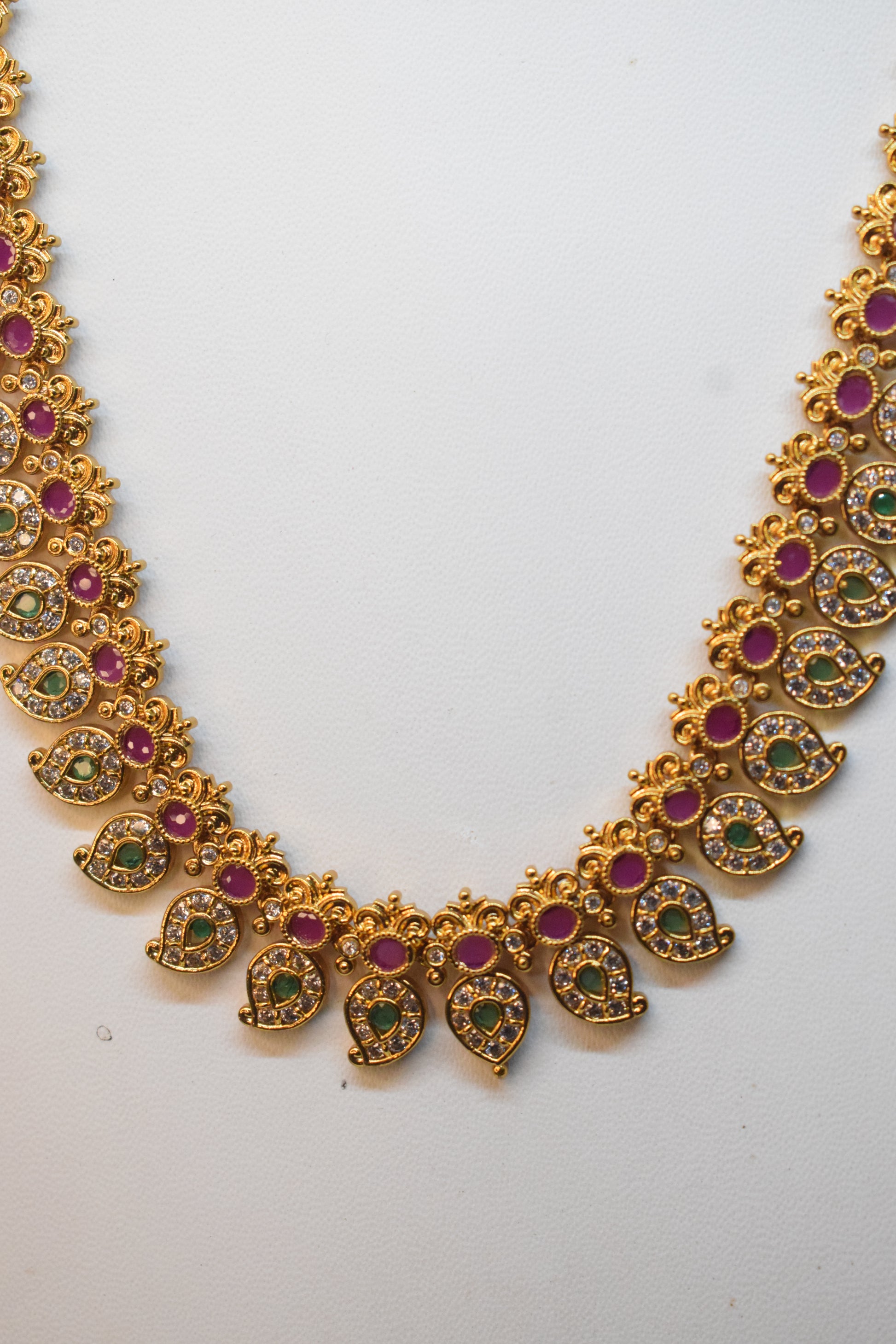 This exquisite long mango mala adorned with white, red, and green stones exudes royal elegance, perfectly complementing sarees and lehengas. Ideal for festivals and weddings, it adds a timeless charm to your traditional ensemble.
