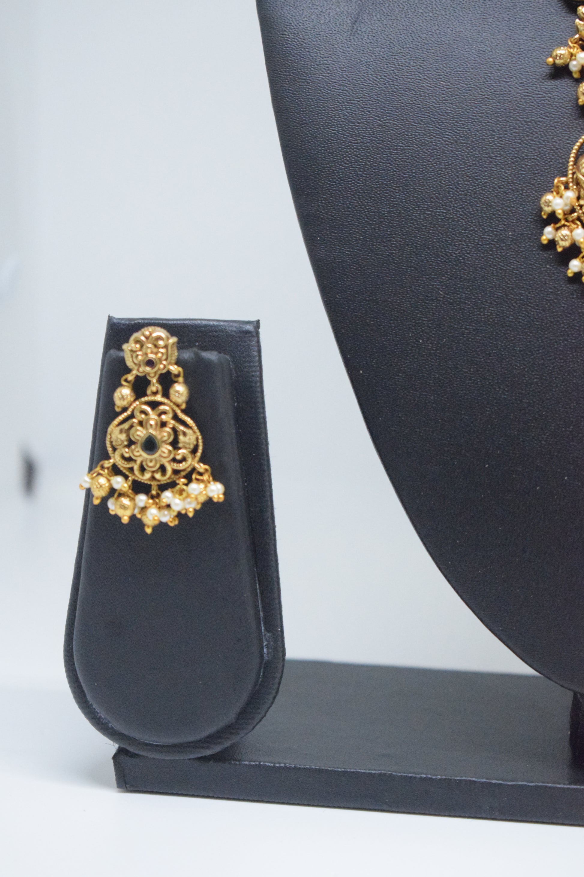 This medium-length haram features a striking big locket adorned with pearls and stones, accompanied by matching earrings, perfect for elevating your festival attire.
