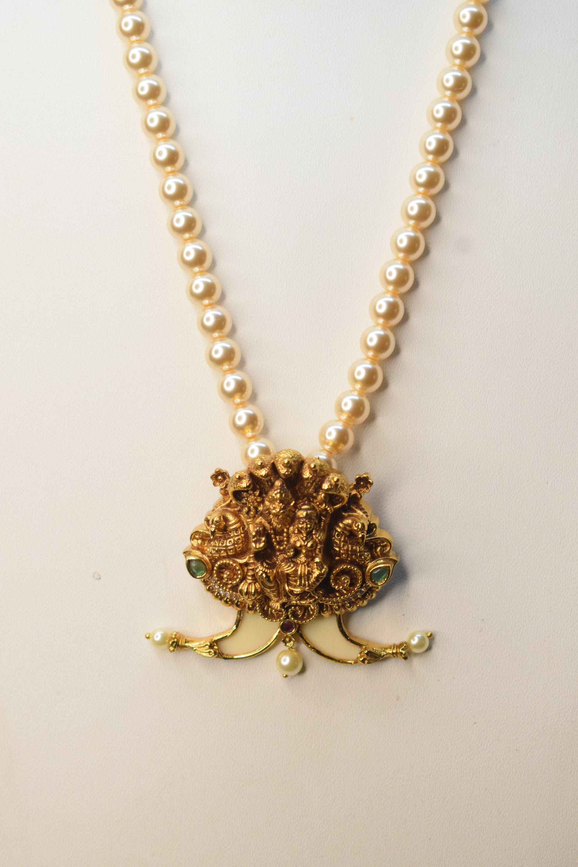 Elegant pearl chain adorned with a traditional puligoru locket, perfect for adding authentic charm to sarees and kurtas. This unisex piece brings timeless sophistication to festive occasions and weddings, capturing the essence of cultural heritage with its refined design.