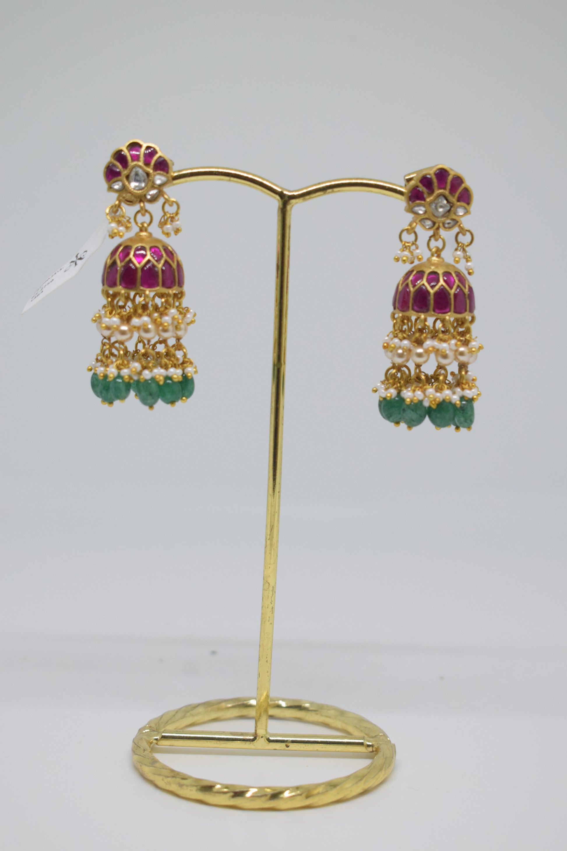 Elevate your festive and wedding attire with these Premium Jadau Kundan long Jhumkas, expertly crafted to blend tradition with elegance. Featuring intricate Jadau and Kundan work, they are adorned with two delicate lines of green and pink beads, adding vibrant color and sophistication. Perfect for adding a regal touch to your ensemble, these jhumkas combine craftsmanship with style for a striking statement at any special occasion.