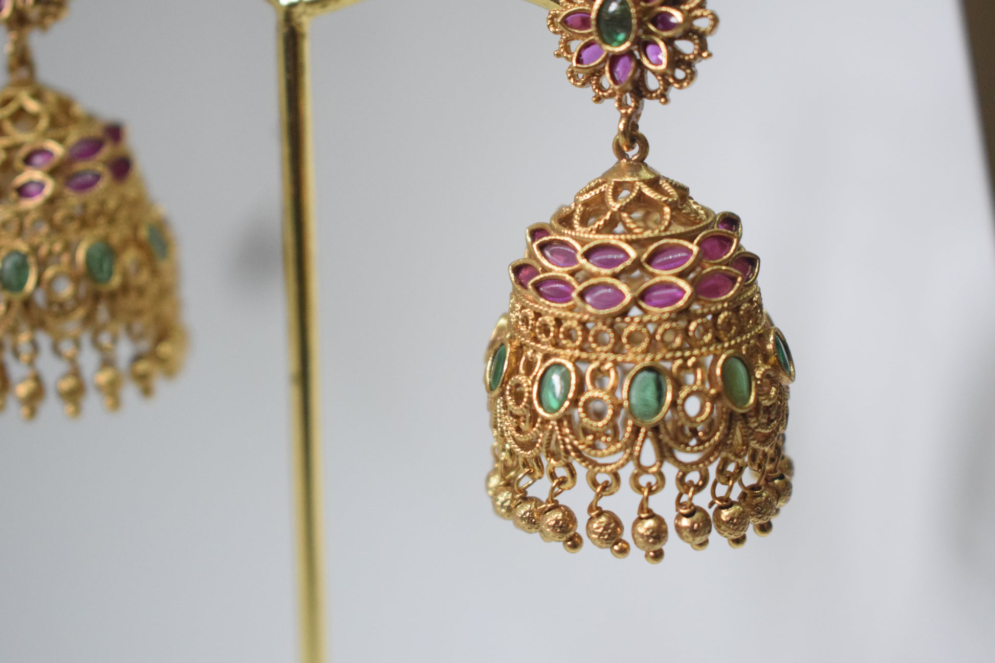 Ruby Jhumkas-2 showcase exquisite craftsmanship with vibrant ruby accents that enhance any outfit. Lightweight and elegantly designed, they offer a perfect blend of tradition and modern style.
