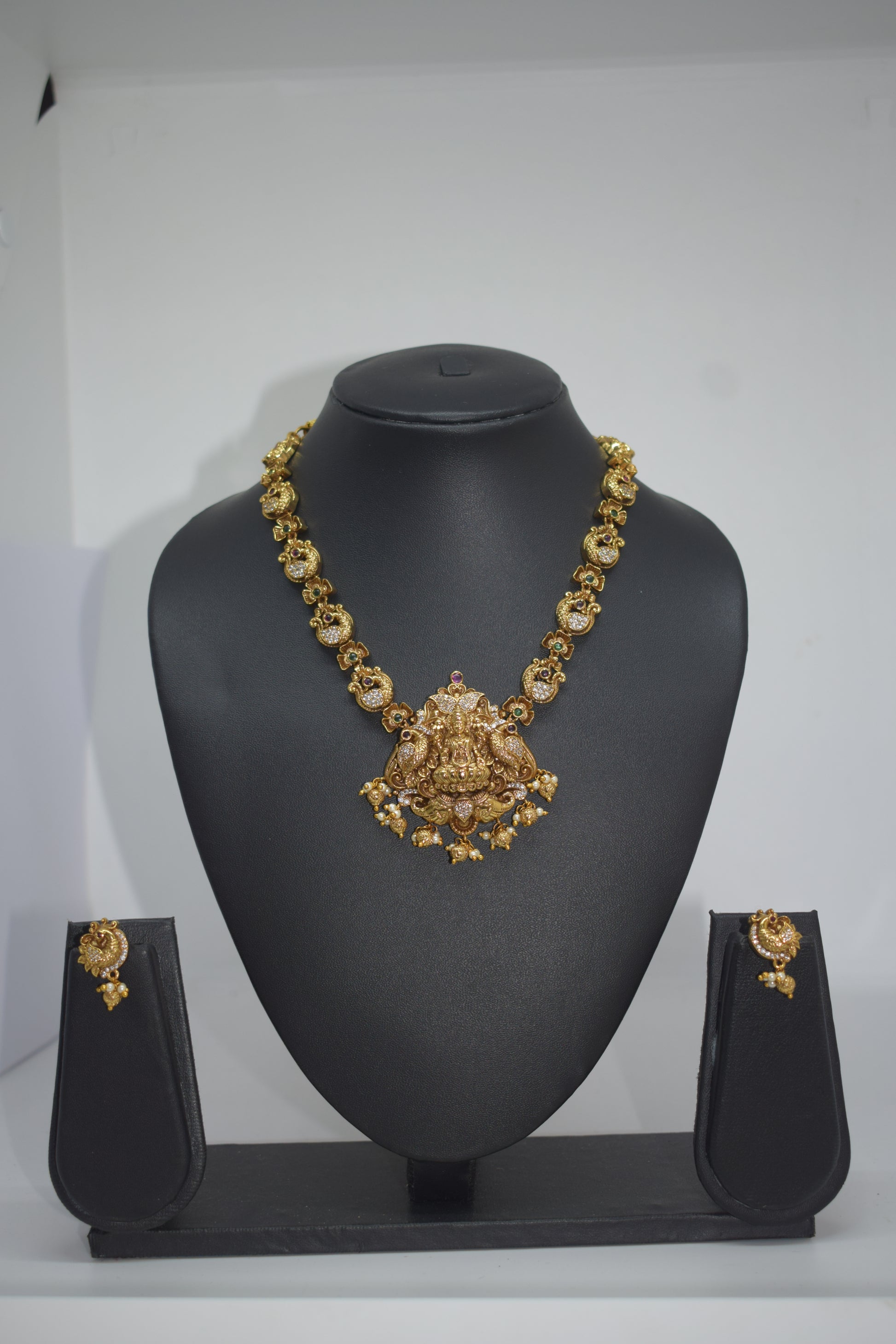 This short 3D Lakshmi necklace with matching earrings features intricate temple motifs, ideal for enhancing your look during festivals and marriages. Expertly crafted to add a touch of traditional elegance to any celebration.