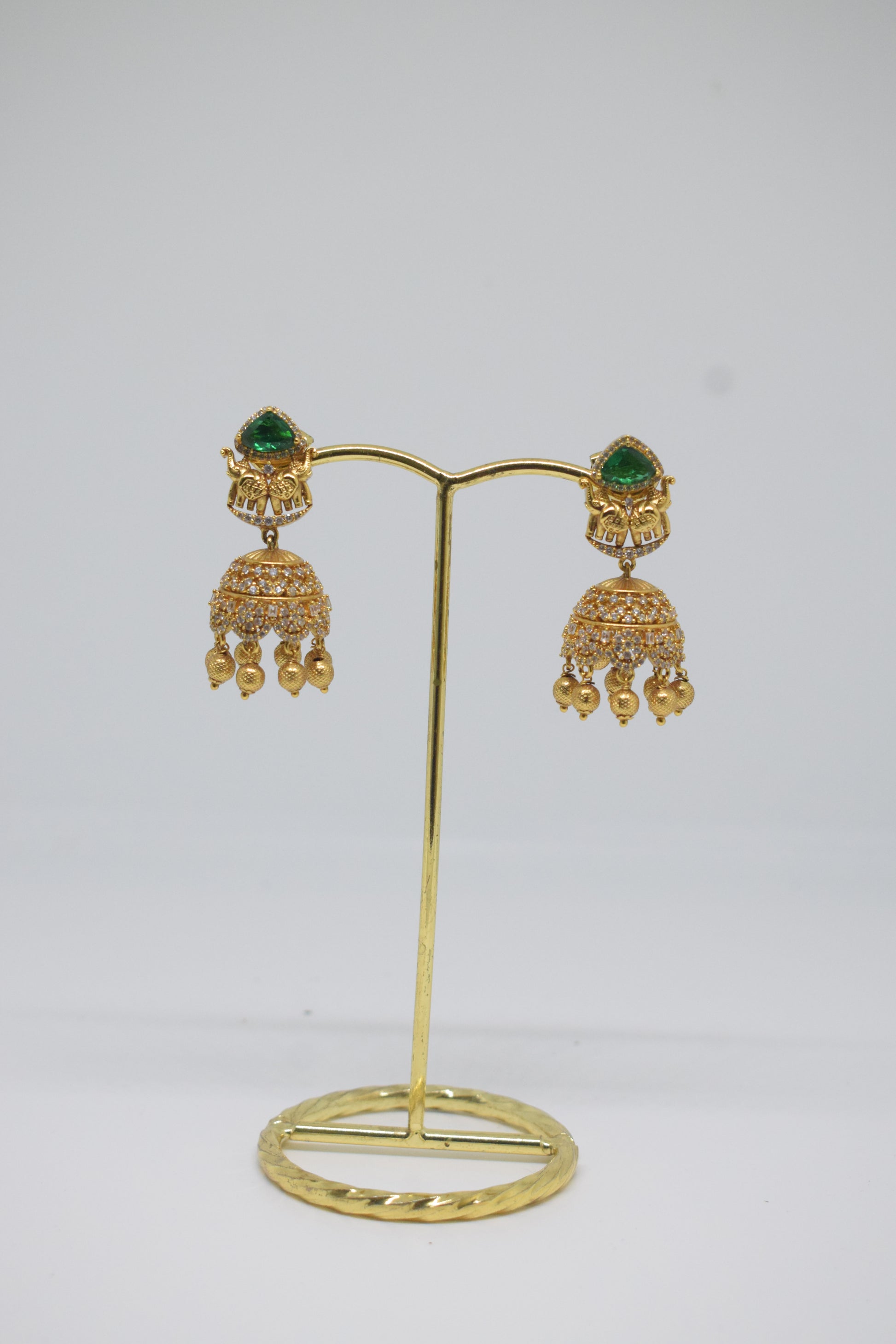 These Statement Jhumkas feature intricate elephant motifs topped with vibrant green stones and elegant gold drops. Their classic design makes them a perfect accessory to enhance your look at parties and festive occasions.