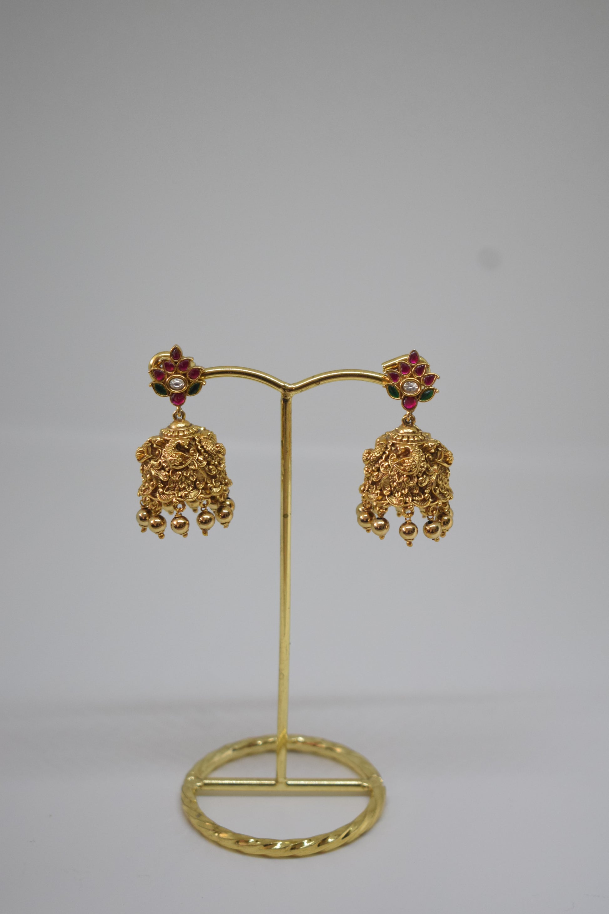 Elevate your festive look with these expertly crafted Temple Jhumkas, featuring intricate designs and a striking ruby accent on top. Perfect for adding a touch of traditional elegance to any celebration.