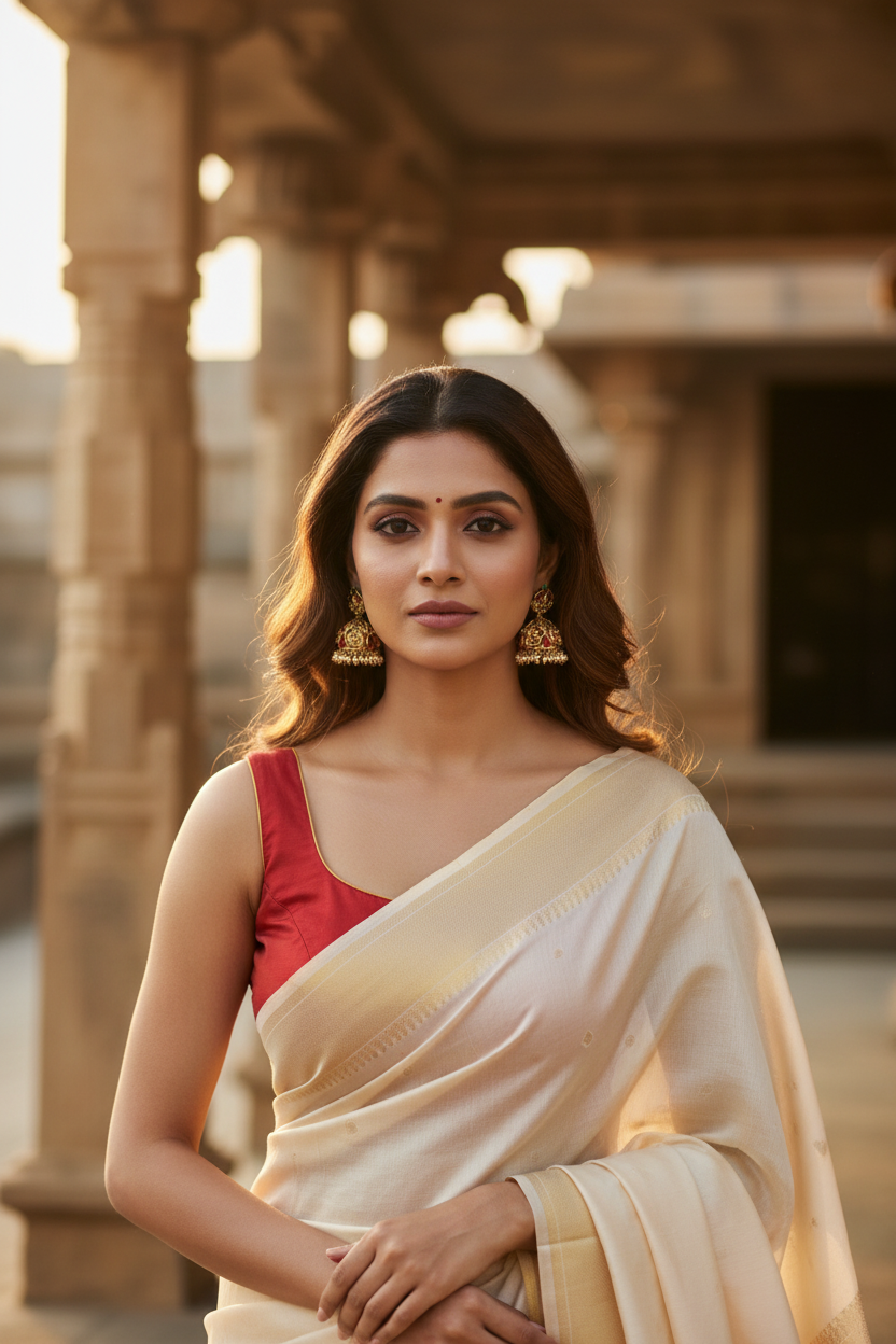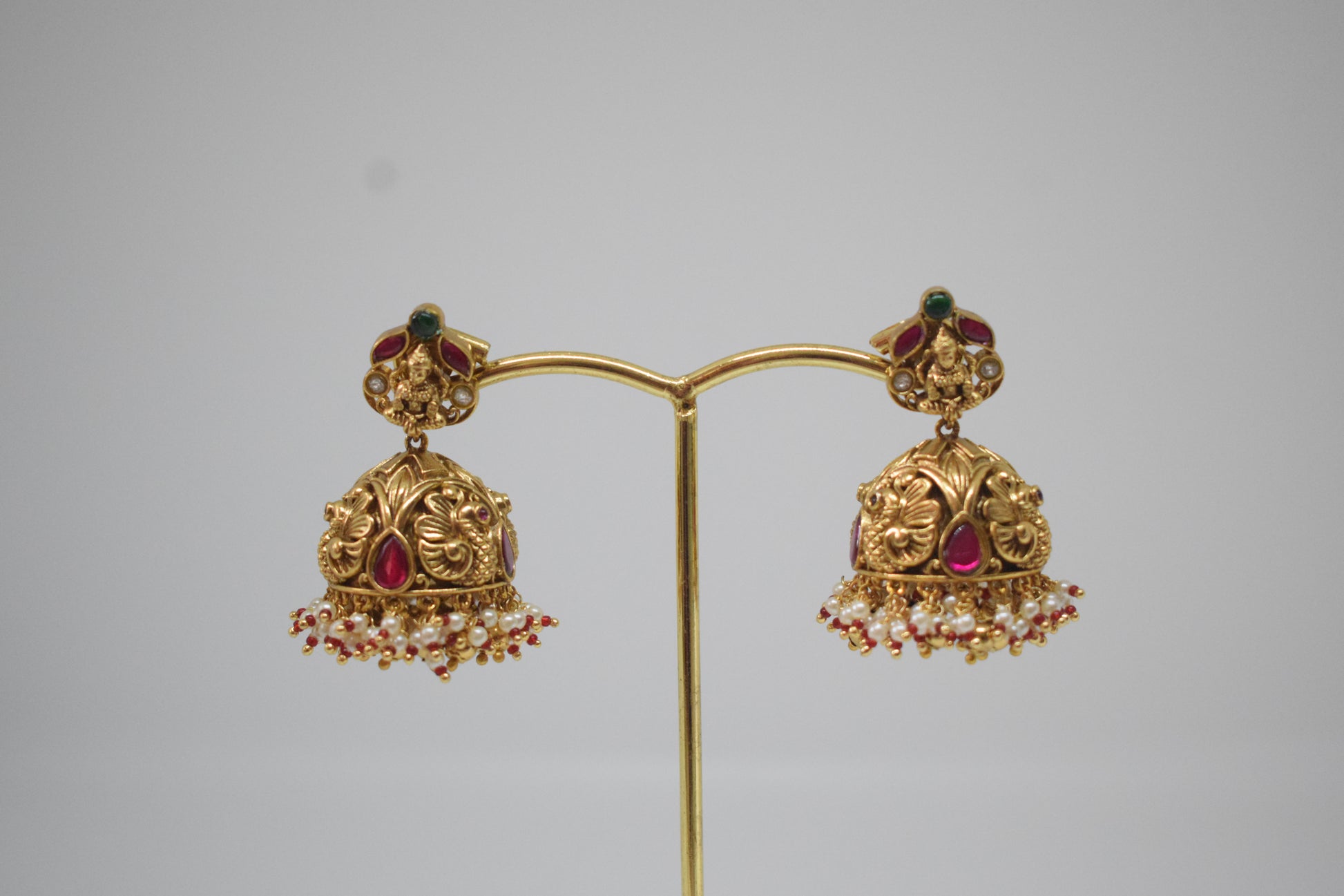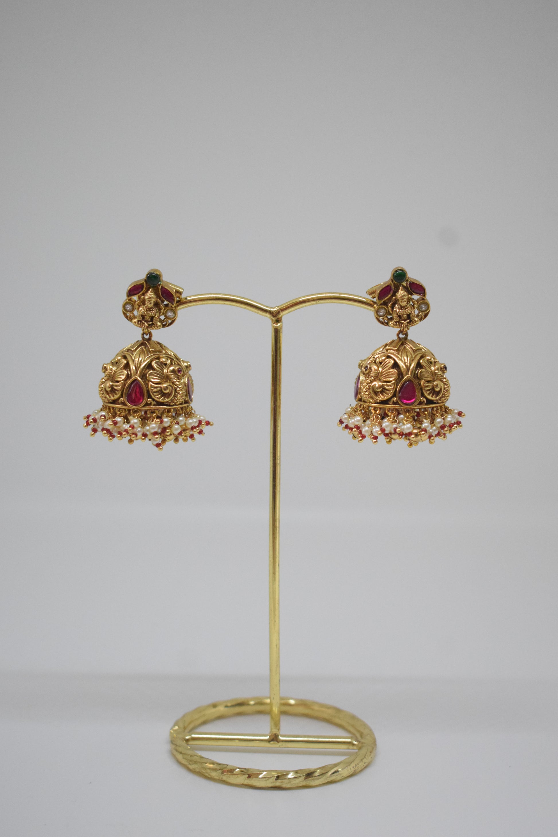 Exquisitely crafted Temple Jhumkas featuring intricate traditional motifs, adorned with lustrous ruby accents and delicate pearl drops. These earrings blend heritage artistry with vibrant gemstones, offering a timeless accessory that enhances any ethnic ensemble with elegance and refined charm. Perfect for special occasions or cultural celebrations, they add a rich statement of craftsmanship and style.