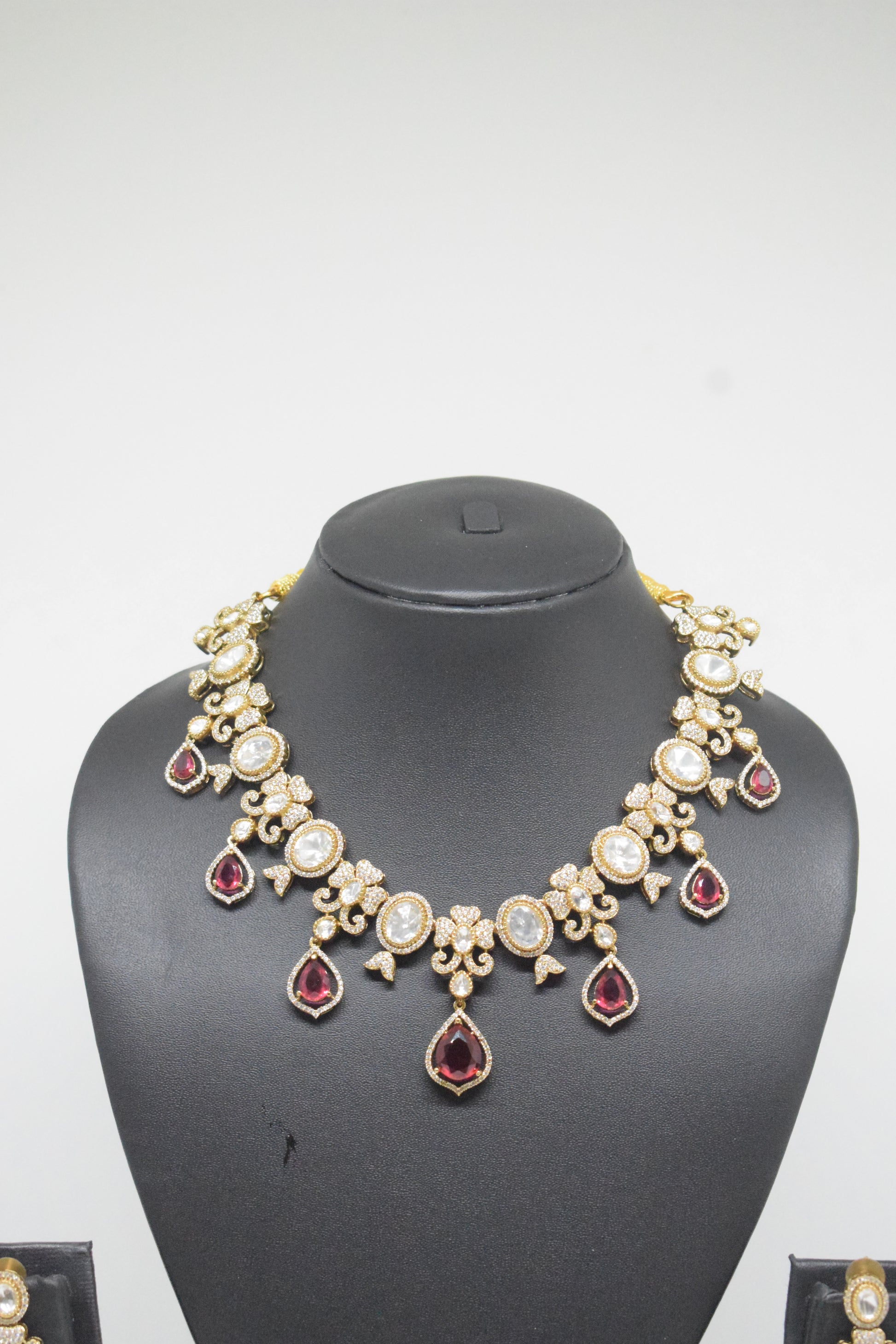 Elevate your festive ensemble with this Victorian-inspired party wear necklace set, featuring a harmonious blend of red and white stones. Designed to complement fancy sarees and lehengas, it adds a refined elegance ideal for receptions, parties, and special functions. The included earrings perfectly match the necklace, completing a sophisticated look that enhances your traditional attire with a timeless charm.